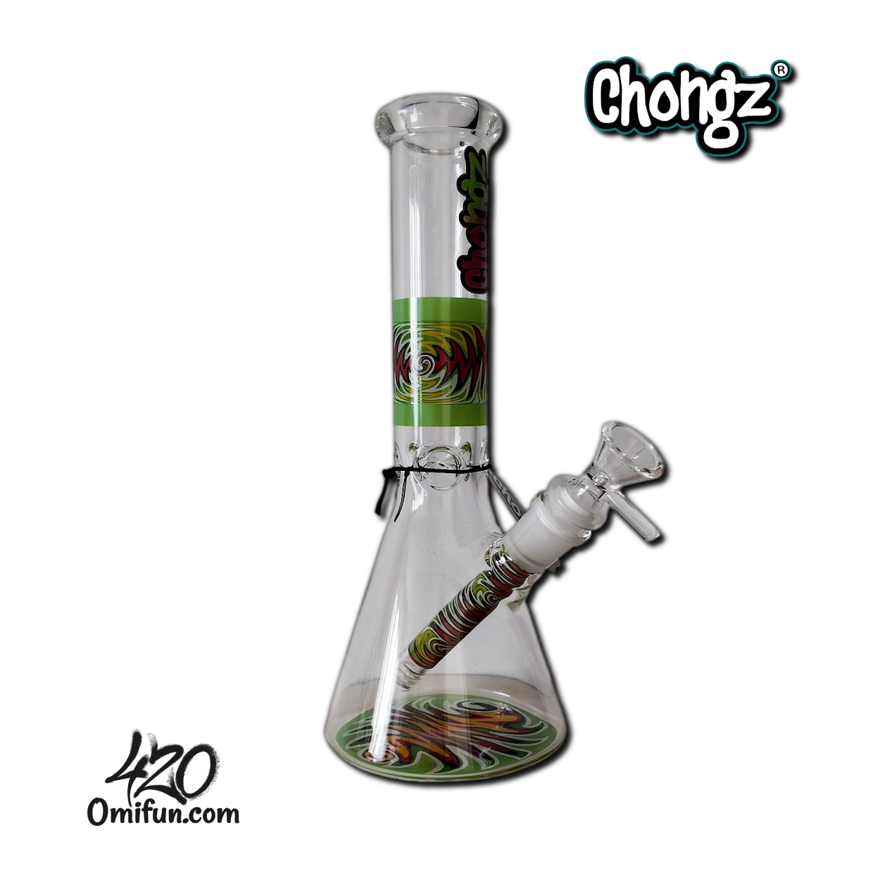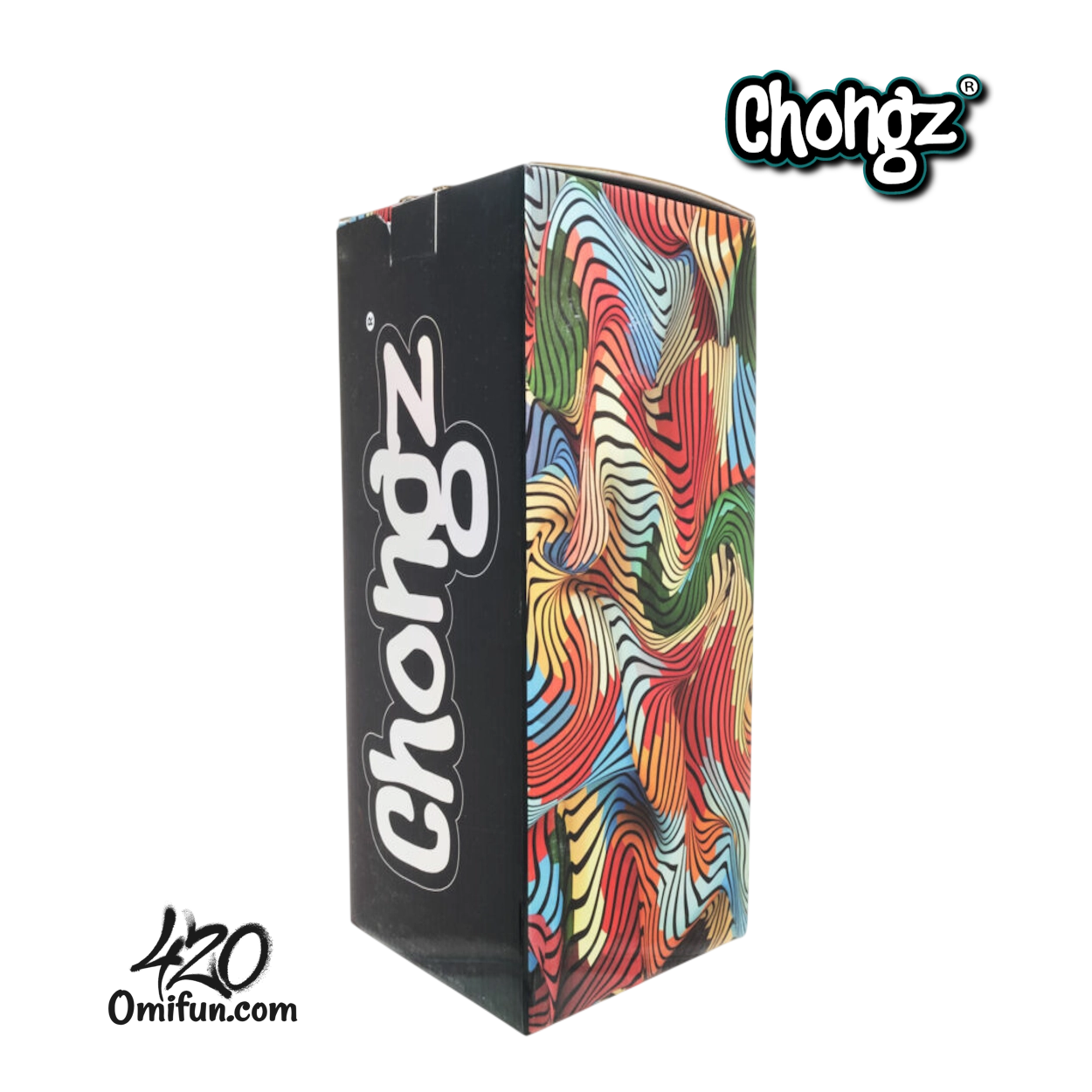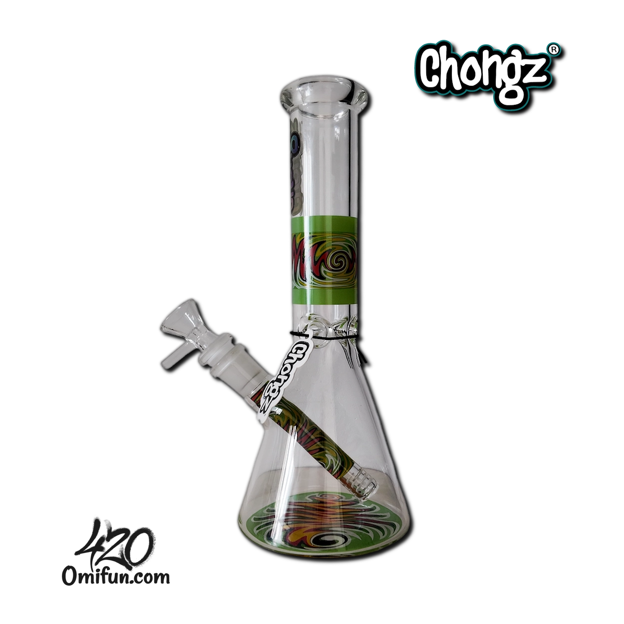 The Chongz 25cm Freak Scene Beaker Ice Bong features durable 5mm borosilicate glass, a wide beaker base for enhanced filtration, a built-in ice pinch, and a removable diffused downstem. Finished with a swirling psychedelic decal and blue neck accents, it combines compact size with reliable performance.